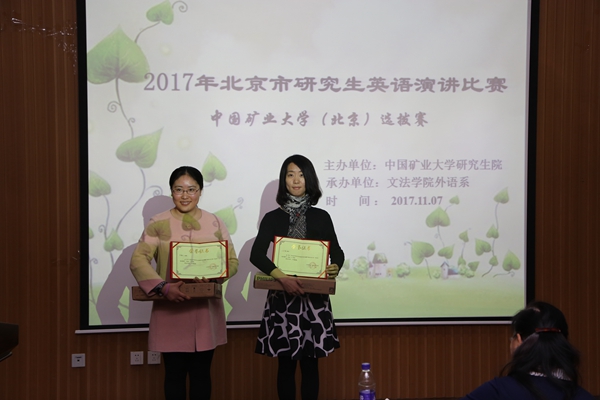 我校研究生英语演讲比赛分初赛和选拔赛两个阶段举行。初赛采取三分钟定题演讲,题目为“Belt and Road Initiative – My Perspective”。选拔赛包括即兴演讲和提问两个环节。经过激烈竞争和紧张角逐,2名同学获得一等奖,4名同学获得二等奖,7名同学获得三等奖。赛后学校对获奖同学进行了表彰,并颁发了获奖证书和奖品,获得一等奖的2名同学将代表我校参加12月初举行的北京市研究生英语演讲比赛复赛。