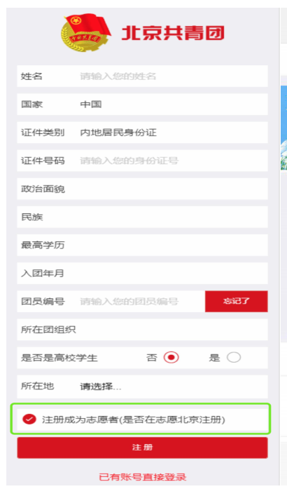 b.“智慧团建”系统中提交个人团组织关系转移申请后,团员需在9日内完成北京共青团线上系统的注册登录,并在系统中通过组织审核,成为组织的正式成员。微信关注“青春北京”微信公众号,在“线上系统”中选择“北京共青团系统”,点击“创建账户”,进行账户注册,注册时请填写真实准确的姓名和身份证号,否则会影响团组织关系的成功转接。此外,注册时需要同时点击“注册成为志愿者”。