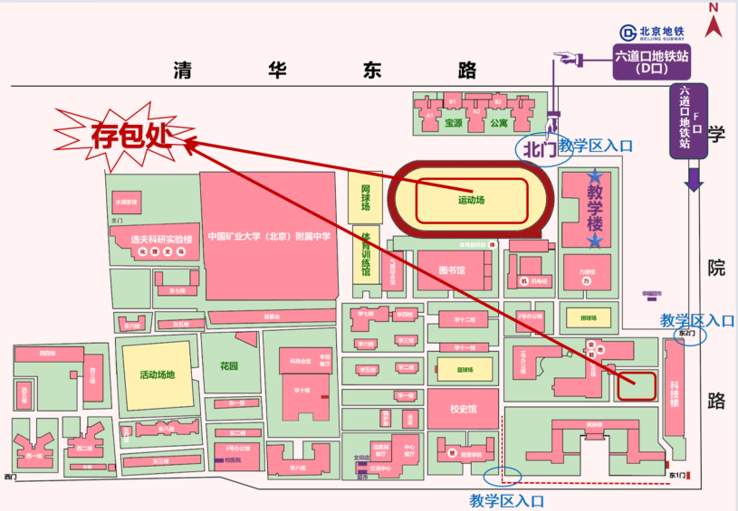2.在教学楼考试的校外人员可从我校北门进入(临清华东路,地铁六道口站D出口附近),在科技楼考试的校外人员可在学校东2门进入(临幸福超市,地铁六道口站F出口附近)。